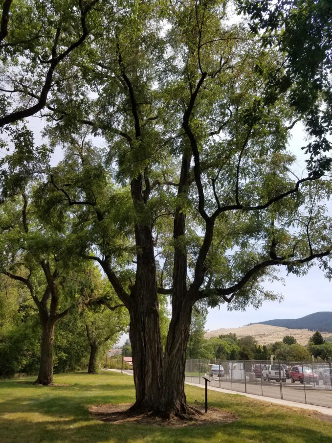 James and Elizabeth Baker were among the first Oregon Trail emigrants to settle in Eastern Oregon. They traveled from Iowa in 1862 and were one of the original five families to settle in what is now the city of La Grande. Most of La Grande was treeless prairie when they arrived. James Baker was known as a horticulturalist and planted many of the first trees in the community. Elizabeth Baker loved the locust trees he planted near their home. When she died in 1883, he planted this black locust near her grave. Into his 80s, he was seen carrying two pails of water up the hill to her grave site to water the tree. As La Grande grew, the remains of Elizabeth Baker were moved to a new cemetery but the locust tree remains.
