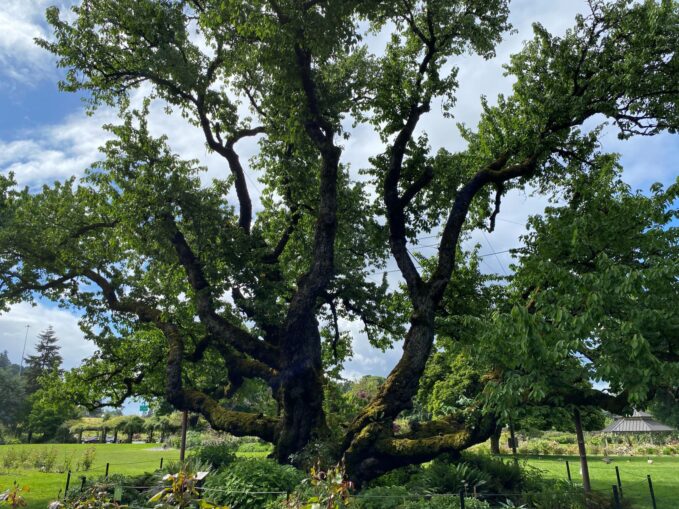 It is believed this tree was planted in the mid 1800s by Eugene Skinner, founder of the City of Eugene in 1853. The tree is within the boundaries of Skinner’s 1846 land claim. By 1850 the site of the tree was owned by George Owen, a former Eugene City Councilor, lumberman, and philanthropist. Mr. Owen donated the site to the city for use as a rose garden.