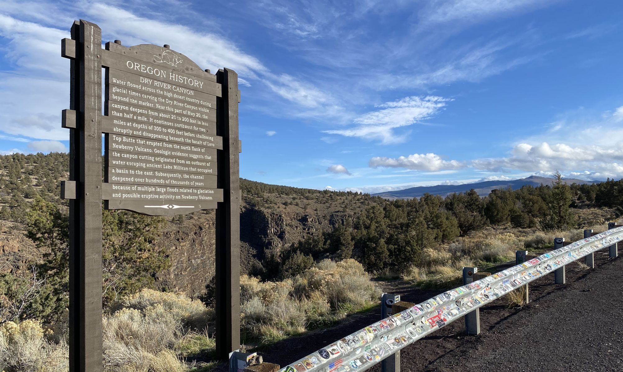 Water flowed across the high desert country during glacial times carving the Dry River Canyon visible beyond the marker. Near this part of Hwy 20, the canyon deepens from about 20 to 200 feet in less than half a mile. It continues northwest for two miles at depths of 300 to 400 feet before shallowing abruptly and disappearing beneath the basalt of Lava Top Butte that erupted from the north flank of Newberry Volcano.